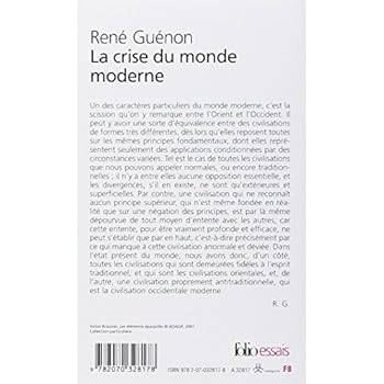 La lecture de l'oeuvre de René Guénon nous fait comprendre que la vision du monde héritée de notre société est fondamentalement erronée. Par elle, les yeux d'Ezéchiel sont ouverts. Cette lecture a pour fonction de répondre à une quête spirituelle antérieure. La crise du monde moderne, de René Guénon, ouvrage publié en 1927, trouve son développement définitif dans Le règne de la quantité et les signes des temps, publié en 1945. Le premier de ces ouvrages constitue, avec Orient et Occident, une critique générale des valeurs régissant le monde moderne, du point de vue de la tradition primordiale. Le deuxième de ces ouvrages décrit dans son intégralité l'ensemble du processus métahistorique ayant conduit le monde occidental moderne dans une direction contre-initiatique, ou anti-traditionnelle, allant à rebours de son développement légitime. René Guénon nous montre que cette situation de crise n'est pas accidentelle, mais qu'elle constitue, au contraire, le point d'orgue d'une déviation civilisationnelle qui remonte précisément à l'Atlantide. Après la destruction cataclysmique de cette dernière, l'Egypte pharaonique rassembla les connaissances ésotériques éparses de cette tradition atlantéenne, dont la fin ne fut que la conséquence d'une déviation civilisationnelle, due à un développement trop exclusif de connaissances d'ordre essentiellement cosmologique, au détriment de la métaphysique et de la spiritualité pure. Or, dans la suite des temps, devait de nouveau réapparaître, en Occident, cette contre-tradition archaïque, qui allait cette fois se développer à l'encontre, et à rebours des religions révélées, d'origine divine. Cette contre-tradition agissant dans l'ombre, comme le moteur secret d'un monde réellement inversé - tel un Chakravarti à rebours. Il s'agit d'une généalogie de la métahistoire, d'une portée prophétique, eschatologique et apocalyptique, renvoyant le lecteur à la lecture attentive de l'Apocalypse de Saint-Jean. Le regard ainsi porté sur le monde actuel est en même temps subversif. A l'aide de repères intellectuels essentiels, René Guénon nous donne une vue d'ensemble de la destinée du monde moderne. Ces deux ouvrages forment un préalable initiatique indispensable pour aborder les ouvrages doctrinaux plus fondamentaux, portant sur l'exposé des principes métaphysiques eux-mêmes, qui ne s'adressent pas nécessairement à tous les publics. Dans La crise du monde moderne, René Guénon démontre la totale vacuité des valeurs du monde moderne, en suivant un enchaînement logique, inéluctable, d'une lucidité magistrale : l'individualisme, l'illusion démocratique (le peuple ne peut pas être la source d'un pouvoir auquel il est de fait soumis), l'illusion du progrès (d'un monde matériel à rebours du spirituel), l'évolutionniste (qui est une mythologie matérialiste), le chaos social, l'envahissement occidental... Nous constatons que l'état du monde actuel est essentiellement descendant, ou centrifuge, et ne peut être décrypté que comme procédant d'un éloignement progressif à partir du principe causal de la manifestation universelle. Comme l'indique la tradition primordiale, avec les quatre âges de l'humanité, dans les Puranas hindous, nous sommes depuis longtemps au terme du Kali-Yuga (l'âge de fer de l'Antiquité, et dans la Bible, le Livre de Daniel). Ainsi, comme nous le rappelle René Guénon, la fin de ce monde n'est jamais et ne peut jamais être autre chose que la fin d'une illusion.